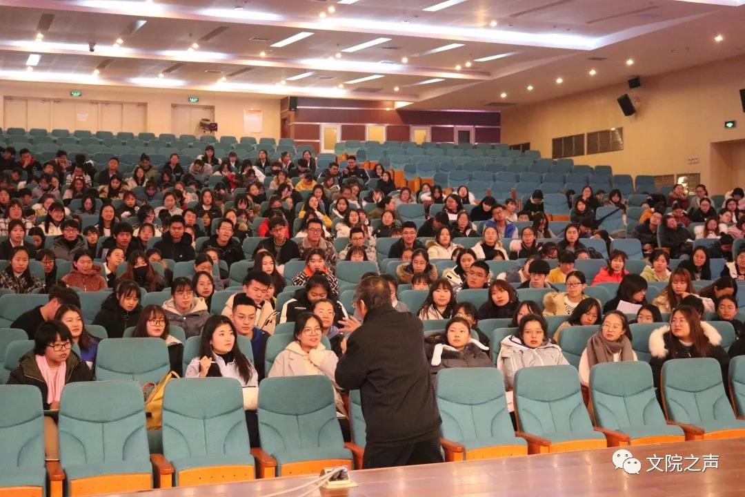 年过古稀的杨燕民老师以幽默风趣的语言、抑扬顿挫的语调和充满激情的朗读为现场的师生带来了一场别开生面的“诵读课”。两个多小时的讲座,杨老师重点为同学们讲解了朗读的六项基本功:吐字、呼吸、语法重音和逻辑重音、三腔共鸣、节奏和速度和语言艺术的一条红线:感情。