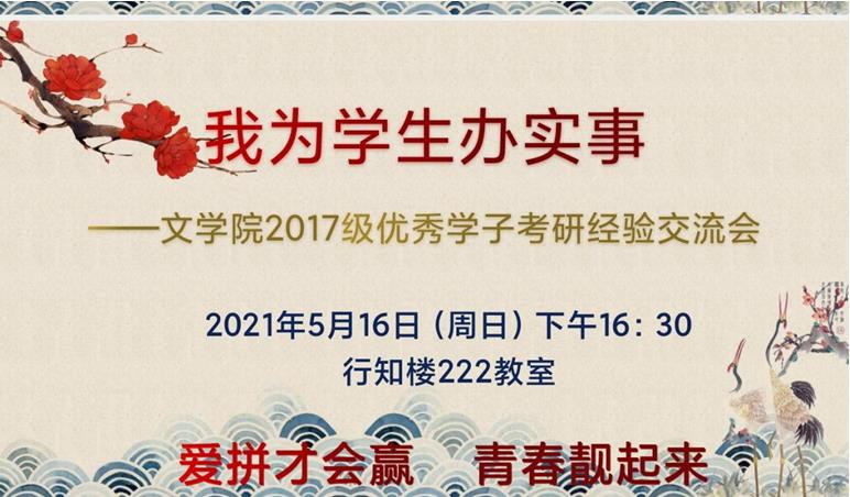 2021年5月16日,汉语言文学系、汉语国际教育系、秘书系共同策划的“beat365英国官方网站2017级优秀学子考研经验交流会”在行知楼222教室举行,会议的主题是:“爱拼才会赢,青春靓起来”。