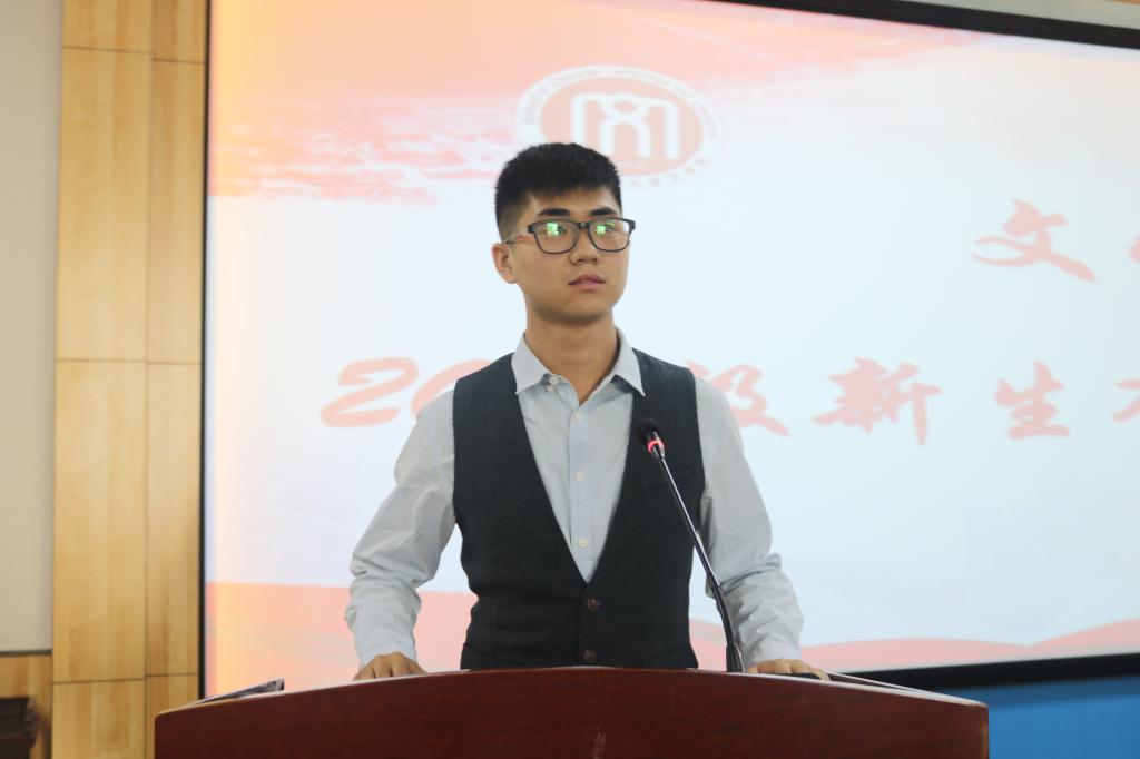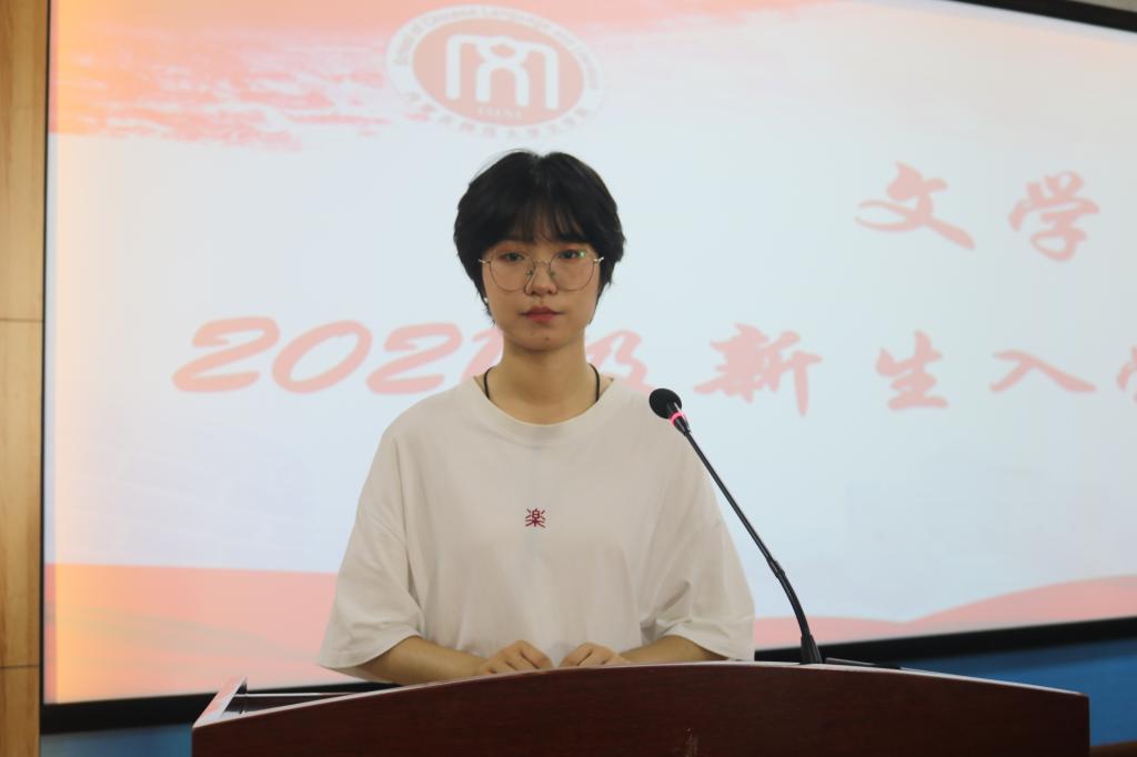 王乐源代表本科生新生做了发言。发言中她表达了对大学生活的向往和认识,表示将不负韶华,潜心学习,努力提升专业素养。