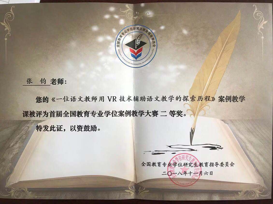 2018年11月6日,由教育部学位与研究生教育中心、全国教育专业学位研究生教育指导委员会联合主办,西南大学承办的首届全国教育专业学位案例教学大赛在西南大学落下帷幕,beat365教师张钧博士的案例教学课《一位语文教师用VR技术辅助语文教学的探索历程》获得本次案例教学大赛二等奖。