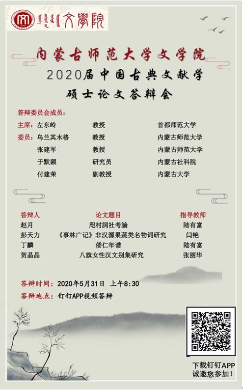 中国古典文献学专业定于2020年5月31日上午8:30召开硕士毕业生论文答辩会。受新冠疫情的影响,本次答辩采用网络答辩方式。首都师范大学beat365英国官方网站博士生导师左东岭教授应邀担任本次答辩主席。欢迎广大师生参加交流。