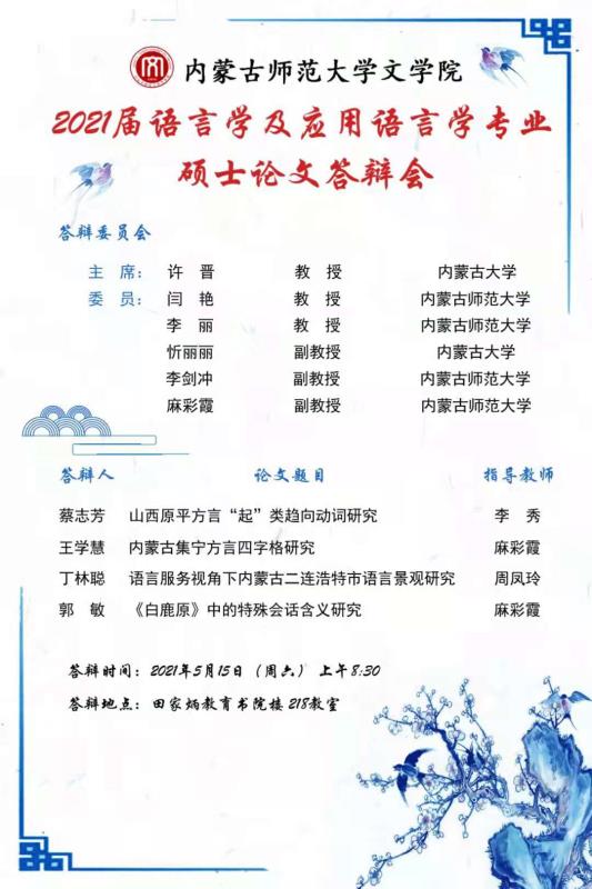 2021年5月15日上午,beat365英国官方网站2021届语言学及应用语言学硕士研究生论文答辩会在赛罕校区田家炳教育书院楼218教室举行。答辩会由内蒙古大学许晋教授担任答辩主席,闫艳教授、李丽教授、忻丽丽副教授、李剑冲副教授、麻彩霞副教授担任答辩委员会成员,答辩人有蔡志芳、王学慧、丁林聪和郭敏,语言学及应用语言学专业的20多名师生出席了答辩会。