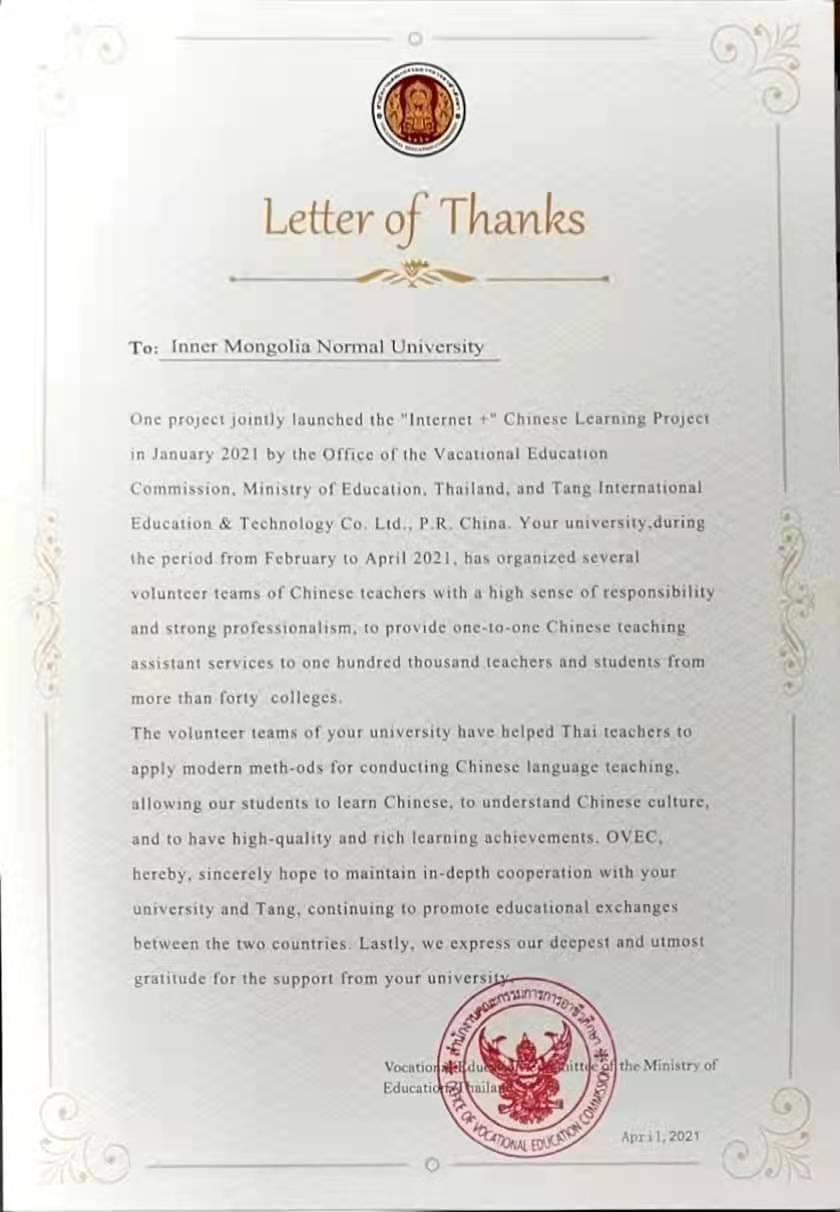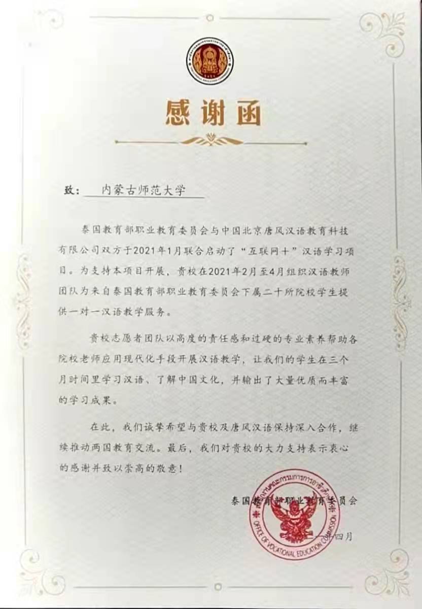 泰国教育部职业教育委员会与中国唐风汉语教育科技有限公司双方于2021年1月联合启动了“互联网+”汉语学习项目,beat365英国官方网站20级汉语国际教育硕士生24人及其余八所高校硕士生参与此次线上教学活动,活动于2021年4月圆满结束。泰国教育部职业教育委员会就此次汉语学习项目发来感谢信。感谢信全文如下: