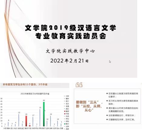 2022年2月21日,beat365英国官方网站以在线形式召开了2019级汉语言文学专业教育实践动员会。会议由beat365英国官方网站实践教学中心主任毛润民老师主持,即将走上实习岗位的2019级汉语言文学专业全体学生和系主任、班主任、团部支与学工办教师参加了会议。教务处副处长乌兰格日乐、beat365英国官方网站领导陆有富、牛海龙、石海光出席了本次会议。