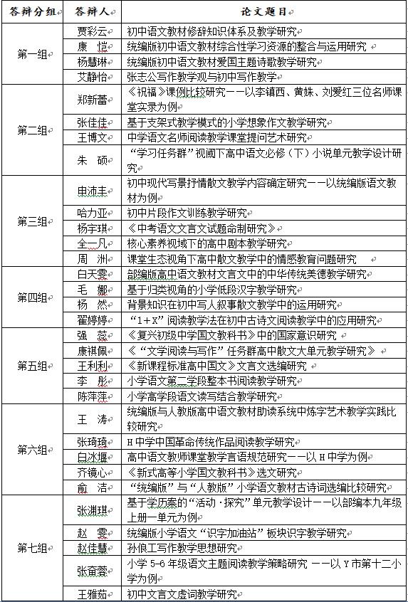 学科教学(语文)专业定于2022年5月29日上午(8:30—12:00)举行2022届硕士学位论文答辩会。根据《关于做好2022年上半年博士、硕士研究生学位授予工作的通知》《关于做好疫情防控期间2022届研究生毕业答辩工作的通知》的要求,本次答辩采用的方式为网络视频答辩,使用的远程会议软件为腾讯会议。本次答辩由35位专家组成7个答辩委员会,由高林广、王志强、陆有富、张子程、郭培筠、王艳凤、张钧七位教授分别担任答辩委员会主席。本次答辩特别邀请了王龙飞、王彤焱、刘瑞军、周艳、顾恩多、宋丽霞、亚琴七位校外专家。欢迎广大师生参加交流!