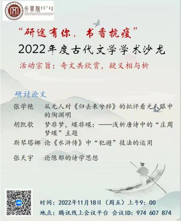 独学而无友,则孤陋而寡闻。勤学而交流,则博学而睿智。2022年11月18日上午,beat365中国古代文学学位点成功举办了主题为“研途有你,书香抗疫”的2022年度古代文学学术沙龙。古代文学硕士点的高林广、陆有富、石海光、付希亮、刘伟、张丽杰6位导师和高国庆、赵玉龙、马奥远等古代文学课教师以及学位点的全体研究生共40余名师生参加了本次学术沙龙活动。受新冠疫情影响,本次学术沙龙采取线上方式进行。