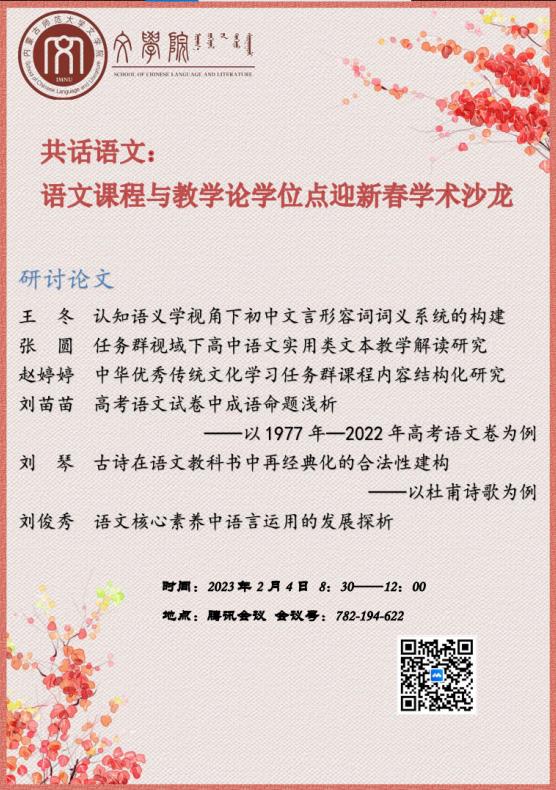 2023年2月4日,beat365语文课程与教学论硕士学位点举办了“共话语文:语文课程与教学论学位点迎新春学术沙龙”,活动通过腾讯会议平台线上举行,学位点教师阚小琴、王志强、张钧及全体研究生参加了本次活动,活动由学位点2021级研究生刘苗苗主持。