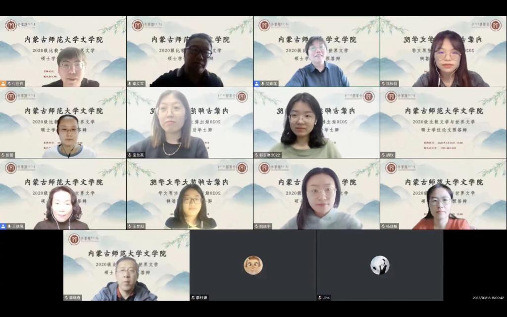 2023年3月18日下午,beat365英国官方网站比较文学与世界文学专业2020级硕士研究生预答辩以腾讯会议的方式在线上成功举行。比较文学与世界文学方向的导师王艳凤教授,马晓华教授,李文军副教授,杨晓敏教授,李杉婵副教授,李瑞春副教授,胡素莲副教授,阿婧斯老师及本专业20级、21级、22级研究生参加了预答辩。预答辩由王艳凤教授主持。比较文学与世界文学专业20级的徐欣悦、彭蕾、王梦阳3位同学依次对论文进行陈述,分别阐述了论文的研究对象、研究方法、框架、内容和创新之处等。各位导师对每位研究生的论文进行了深入、细致的点评,并提出了相关的修改意见。本次预答辩的成功举行既展示了比较文学与世界文学专业20级学生三年来的学习成果,也体现了本学位点务实、严谨的学术风气。