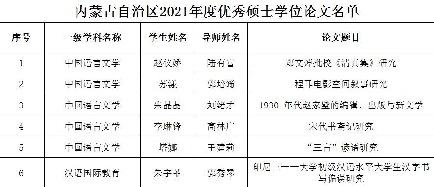 近日,自治区教育厅公布了2021年度自治区优秀博士、硕士学位论文评选结果,beat365《宋代书斋记研究》等6篇硕士学位论文被评为2021年度内蒙古自治区优秀学位论文,其中中国语言文学5篇,汉语国际教育1篇。本次全区共评选出137篇优秀硕士学位论文,我校共有26篇论文被评为自治区优秀研究生学位论文。