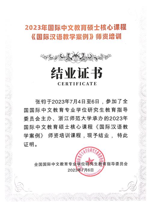 7月4-6日,全国国际中文教育专业学位研究生教育指导委员会秘书处主办、浙江师范大学承办的国际中文教育专业硕士核心课程《国际汉语教学案例》师资培训在浙江师范大学顺利举行。来自全国108所国际中文教育专业学位研究生培养单位的核心课程骨干教师参加培训。张钧副院长参加了本次培训并顺利结业。