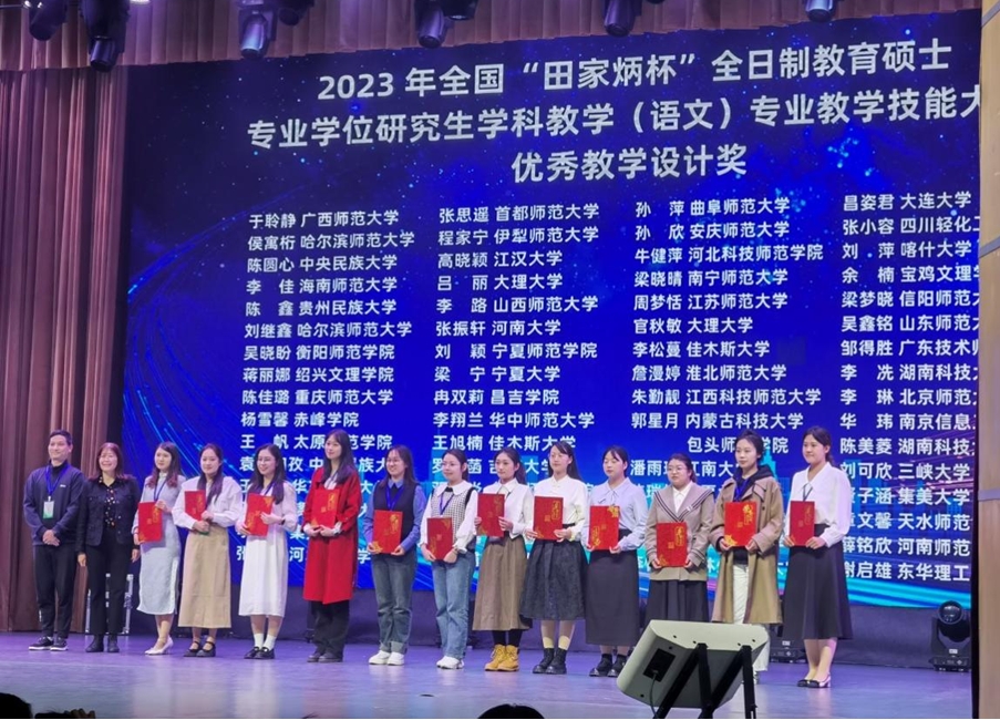 来自全国107所院校的499名选手参加初赛,通过遴选,153名选手进入最后的决赛。beat365选派2022级学科教学(语文)的韩娟、王越两位同学参赛,两位同学凭借扎实的教学基本功,在比赛中脱颖而出,韩娟荣获二等奖,王越荣获优秀教学设计奖,刘伟老师荣获“优秀指导教师”奖。