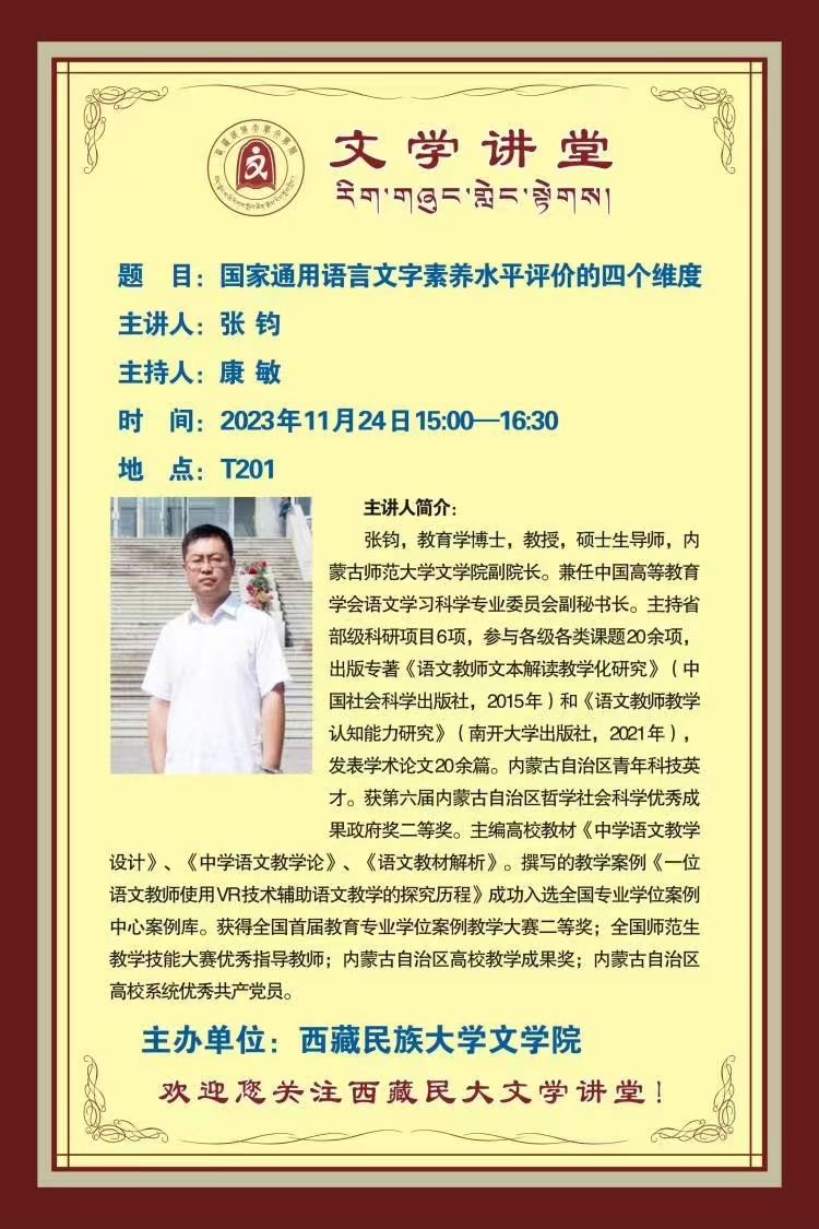 11月24至26日,由陕西师范大学语文教育协同发展研究中心(“百千万工程”办公室)、陕西师范大学beat365英国官方网站主办的第五届西部语文教育论坛暨语文教育“百千万工程”启动仪式在陕西师范大学举行。来自北京师范大学、华东师范大学、西北师范大学、beat365英国官方网站、青海师范大学、宝鸡文理学院等二十余所高校的领导、专家,来自西安市铁一中、西安高新一中、西工大附中、西安交大附中、陕西师大附中等学校的领导、教师以及省市教研机构的教研员90余人参加了会议。beat365张钧副院长应邀参加了本次论坛。论坛期间,张钧副院长还应邀为西藏民族大学beat365英国官方网站师生作了题为《国家通用语言文字素养水平评价的四个维度》的学术报告。
