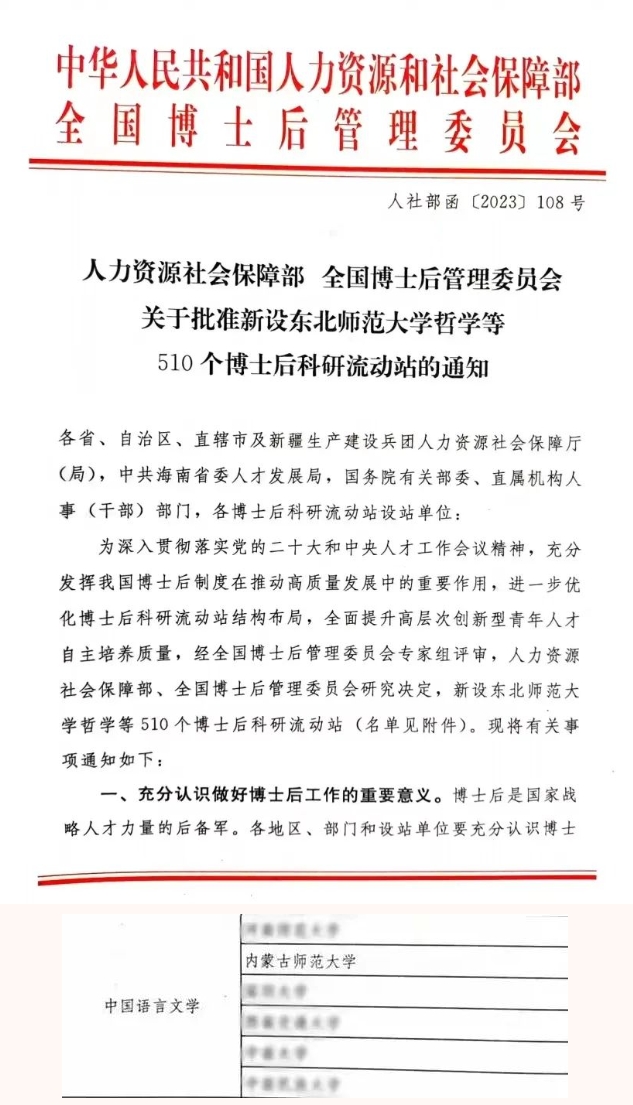 日前,国家人力资源和社会保障部、全国博士后管理委员会正式发布《关于批准设立东北师范大学哲学等510个博士后科研流动站的通知》(人社部函〔2023〕108号),公布了2023年批准新设博士后科研流动站名单。其中,beat365英国官方网站获批新增中国语言文学博士后科研流动站。至此,学院在中国语言文学学科已全面建成本—硕—博—博士后贯通的完整人才培养体系