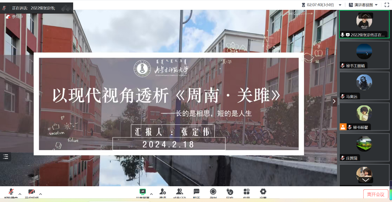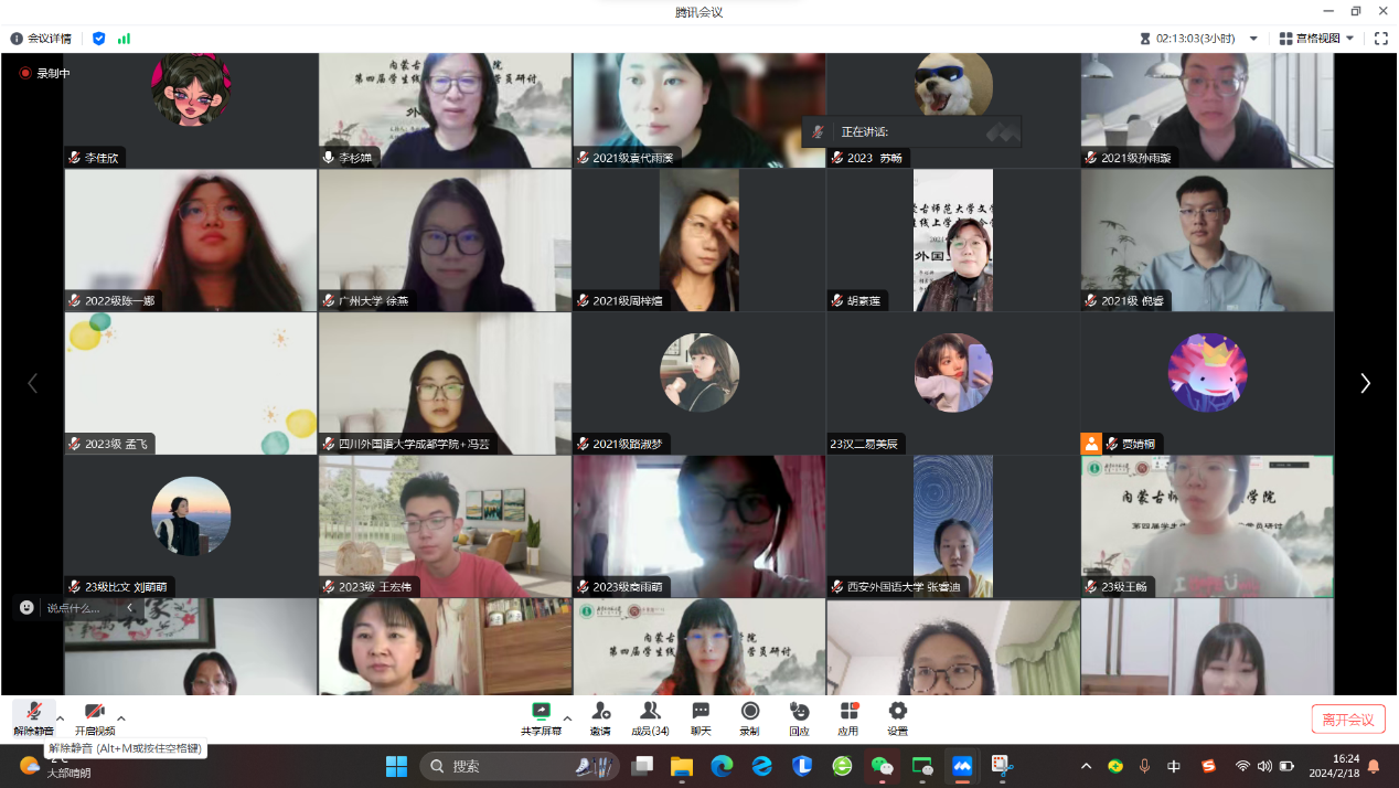 2024年2月18日为期两天的beat365英国官方网站线上学术冬令营活动圆满落下帷幕。本次冬令营面向全国高校在读中文专业学生招生,经过严格选拔,共招收学员100人。其中,除本院各年级各专业学生之外,还有来自东北师范大学、中央民族大学、西安外国语大学、广州大学等高校的学生参加。活动形式主要包括知名专家学术讲座、校友报告、学术论文(读书报告)汇报与点评、营员研讨等内容。