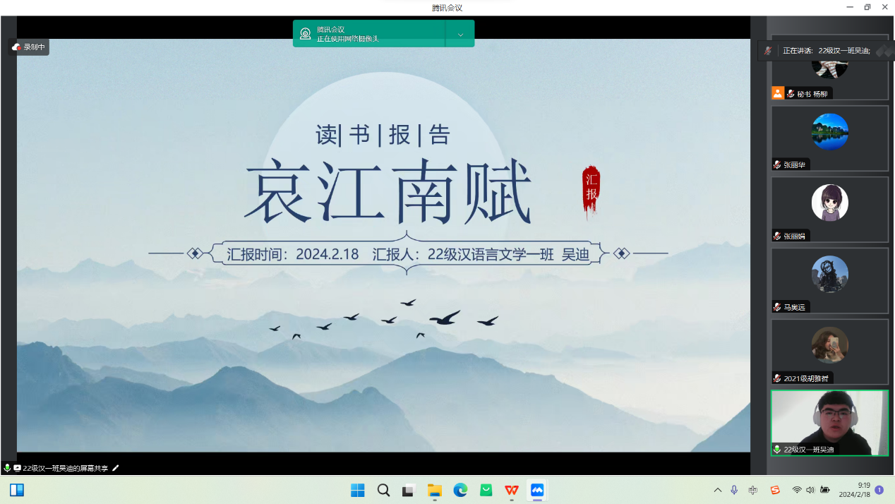 2月18日的活动主要为学术论文(读书报告)的汇报与点评及营员研讨。活动按学科分为四组,分别是中国古代文学组、中国现当代文学组、外国文学组和语言学、文字学组,共57名学生做了线上汇报。beat365教师李杉婵、孙静、马奥远、刘婕分别担任各学科组长,组织了各组的论文(读书报告)汇报评议与营员研讨活动。