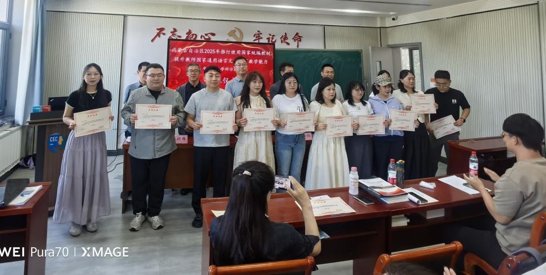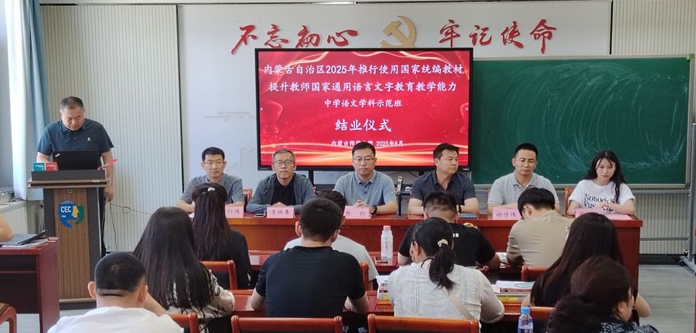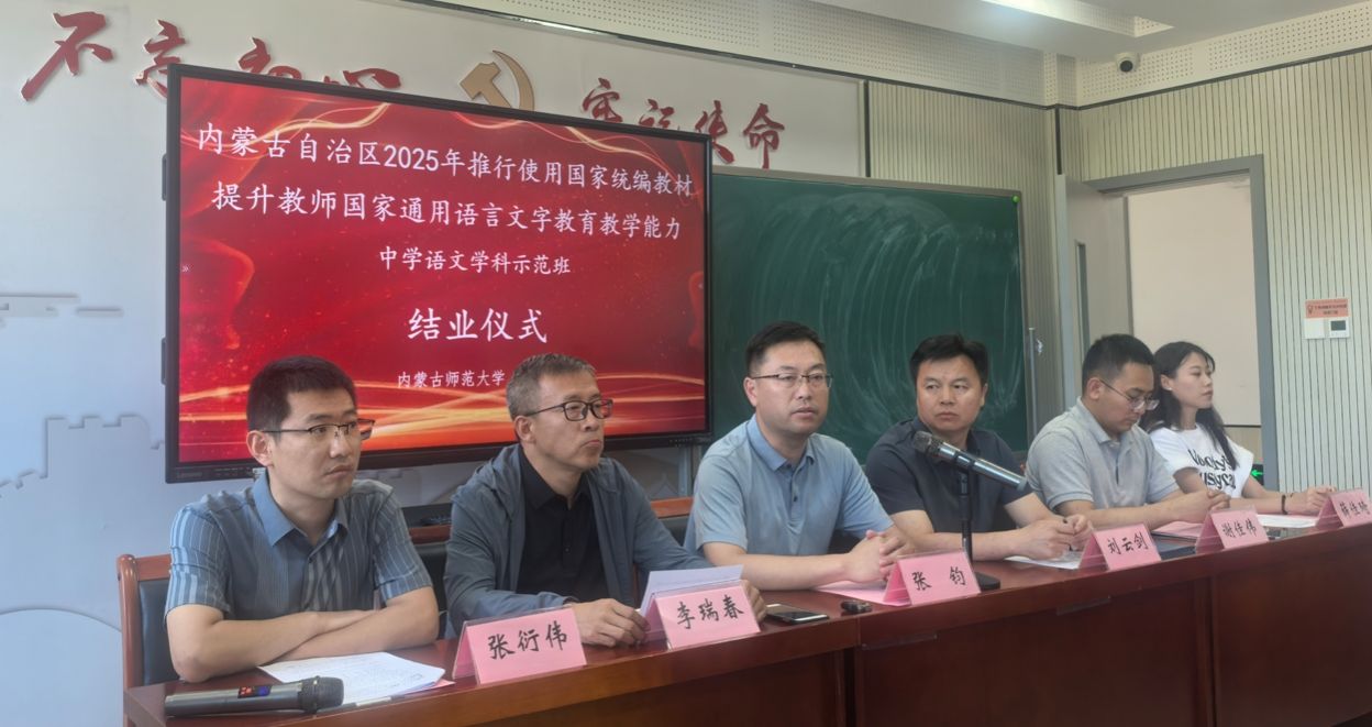 2025年6月20日,beat365与继续教育学院、国家语言文字推广基地(beat365英国官方网站)共同承担的内蒙古自治区2025年推行使用国家统编教材提升教师国家通用语言文字教育教学能力中学语文学科示范班培训工作圆满完成,参训的43位学员全部顺利结业,当日举办了隆重的示范班结业仪式。beat365副院长张钧、汉语言文学系主任李瑞春、青年教师谢佳伟博士出席示范班结业仪式。