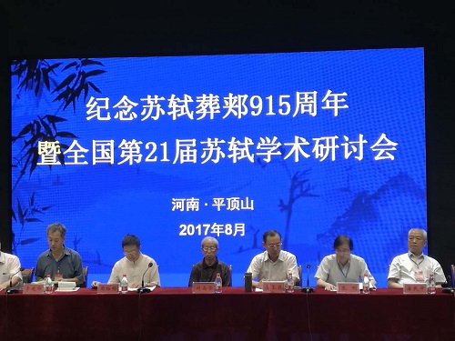 2017年8月22-24日,由中国苏轼研究学会、平顶山学院和平顶山市郏县苏轼文化研究会联合主办,眉山市三苏文化研究院、平顶山学院beat365英国官方网站、平顶学院伏牛山文化圈研究中心、郏县三苏纪念馆共同承办的“纪念苏轼葬郏915周年暨全国第21届苏轼学术研讨会”在河南平顶山学院隆重举行。中华书局编审、中国苏轼研究学会顾问刘尚荣,四川大学文学与新闻学院教授、博士生导师、中国苏轼研究学会会长周裕锴,中国人民大学beat365英国官方网站教授、博士生导师、中国苏轼研究学会副会长冷成金,复旦大学教授、博士生导师、中国苏轼研究学会副会长朱刚,西华大学人beat365英国官方网站教授、中国苏轼研究学会副会长潘殊闲,眉山市三苏文化研究院院长、中国苏轼研究学会秘书长方永江,中国苏轼研究学会常务理事杨常沙,平顶山市三苏文化研究会名誉会长潘民中,郏县三苏文化研究会会长肖根胜等苏学专家,以及来自全国各地的120余位专家学者出席了开幕式。