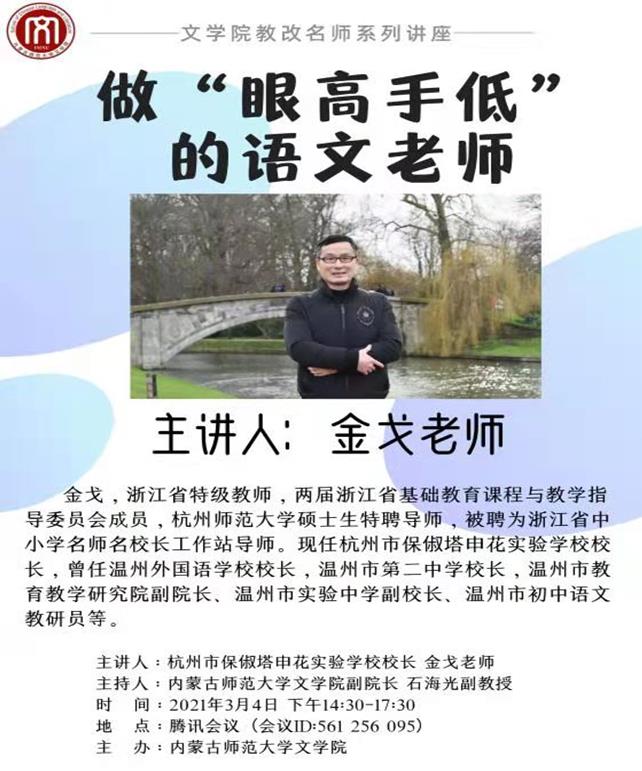 3月4日下午,杭州保俶塔申花实验学校校长金戈为beat365特岗学员与语文教育硕士做题为《做“眼高手低”的语文老师》的学术讲座。石海光副院长主持了会议。