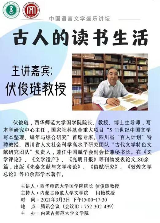 2021年3月3日下午,华西师范大学伏俊琏教授为beat365师生作了题为“古人的读书生活”的精彩学术讲座。本场讲座由闫艳院长主持,采取线上方式进行,beat365相关文学专业50余名师生聆听了本次讲座。