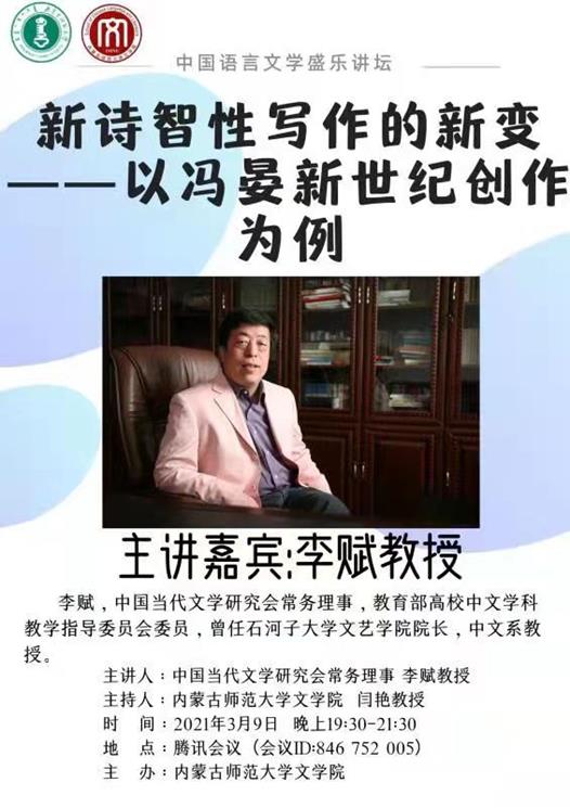 3月9日,应beat365邀请,教育部高校中文学科教学指导委员会委员、中国当代文学研究会常务理事李赋教授为beat365师生作了题为“新诗智性写作的新变——以冯晏新世纪创作为例”的学术讲座。本场讲座由闫艳院长主持,beat365百余名师生聆听了讲座。著名诗人冯晏女士也亲临讲座现场,与beat365广大师生亲切互动。