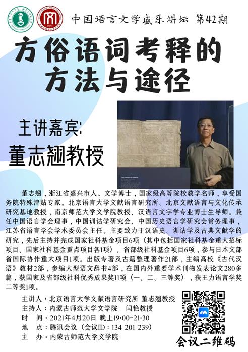 4月20日晚,北京语言大学文献语言研究所董志翘教授为beat365师生做了题为“方俗语词考释的途径与方法”的精彩学术讲座。本场讲座由闫艳院长主持,以线上方式进行,beat36560余名师生聆听了本场讲座。