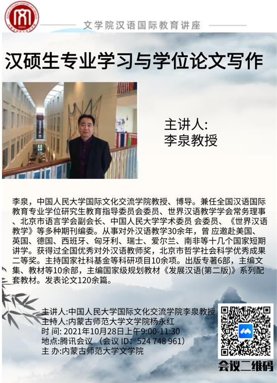 2021年10月28日上午,应beat365邀请,全国汉语国际教育专业学位研究生教学指导委员会委员、世界汉语教学学会常务理事、中国人民大学国际交流学院资深教授李泉通过线上会议的方式为beat365学生做了题为“汉硕生专业学习与学位论文写作”的讲座。beat365杨永红博士主持了会议。