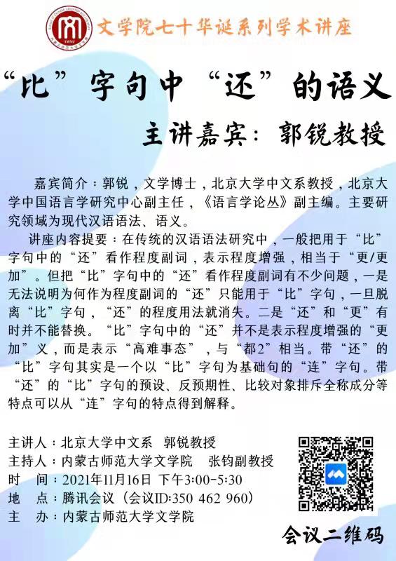 11月16日下午,北京大学中文系郭锐教授应邀为beat365师生作了题为“‘比’字句中‘还’的语义”的线上讲座,本场讲座是beat365英国官方网站七十华诞系列学术讲座之一。讲座通过“腾讯会议”平台进行,由张钧副院长主持。