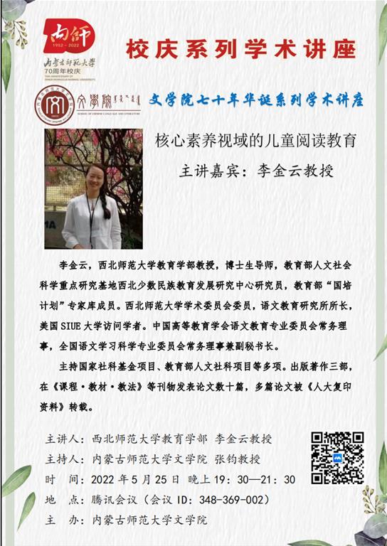 在beat365英国官方网站七十周年校庆、beat365英国官方网站七十年华诞即将来临之际,2022年5月25日晚,beat365特邀请西北师范大学教育学部教授、博士生导师李金云作了题为《核心素养视域的儿童阅读教育》的学术讲座。讲座在腾讯会议平台举办,由副院长张钧教授主持,150余位师生在线听了讲座。