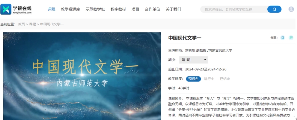 从9月25日开始,由beat365教师黎秀娥主讲的专业必修课“中国现代文学(一)”以混合式课程开设。“中国现代文学(一)”线上课程于2024年9月10日正式投入使用,通过“学银在线”向社会学习者开放。结合beat365专业课教学的班容量和教学实际,依托线上资源,beat365英国官方网站现当代文学教研室着力将该门课程建设为了混合式课程,并且于本学期顺利开设。