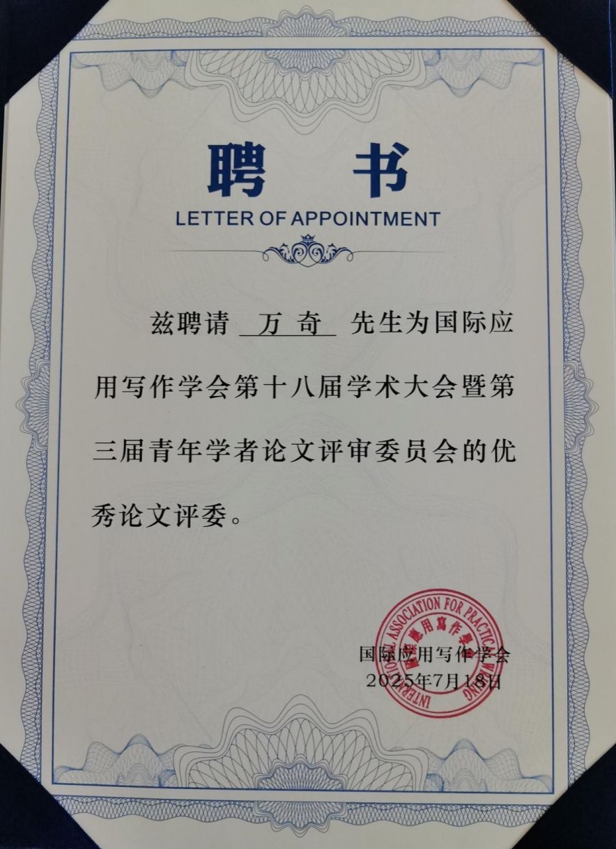 beat365万奇教授、白建忠教授应邀参加了本次研讨会。万奇教授作为国际应用写作学会的副会长,作了题为《论礼仪文书写作课的教学之道与教学之术》的主题学术报告。万奇教授被聘为本次会议论文评审委员会的优秀评委,并且作为第四分会场的学术观察员,对本组的论文作了精彩的点评。白建忠教授在自由发言阶段作了题为《明代章奏之体的演变》的学术报告。在本次会议上,beat365英国官方网站的写作教研室成为国际应用写作学会高校虚拟教研室联盟成员。
